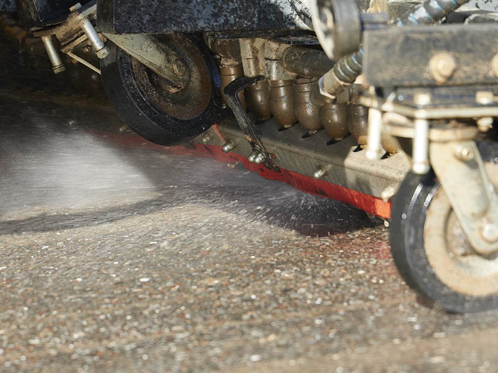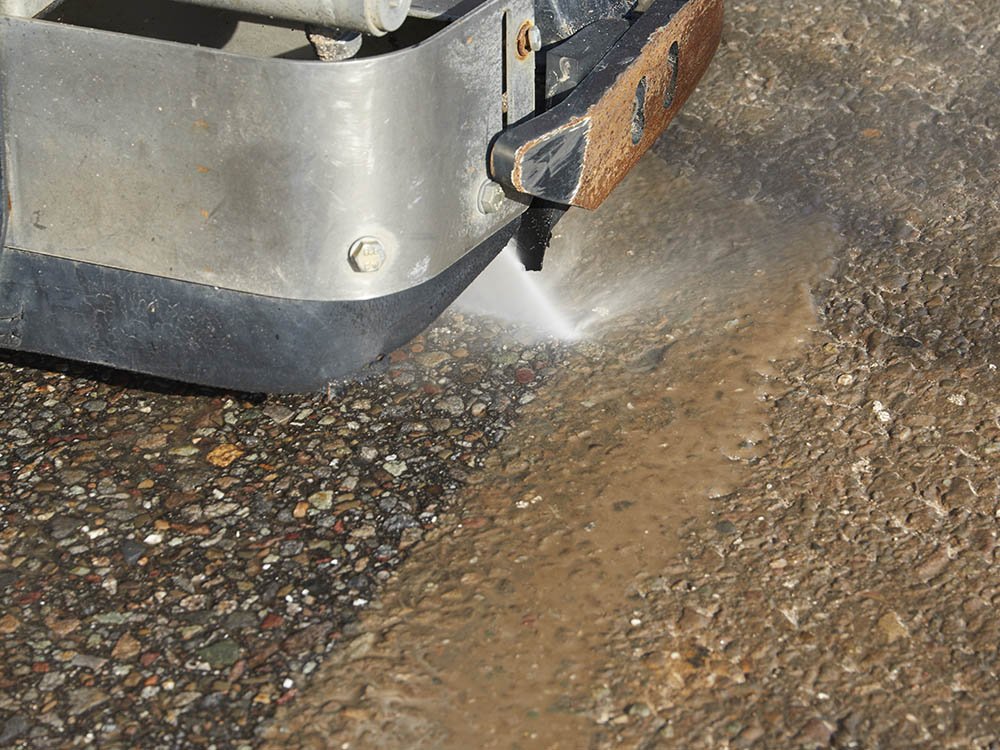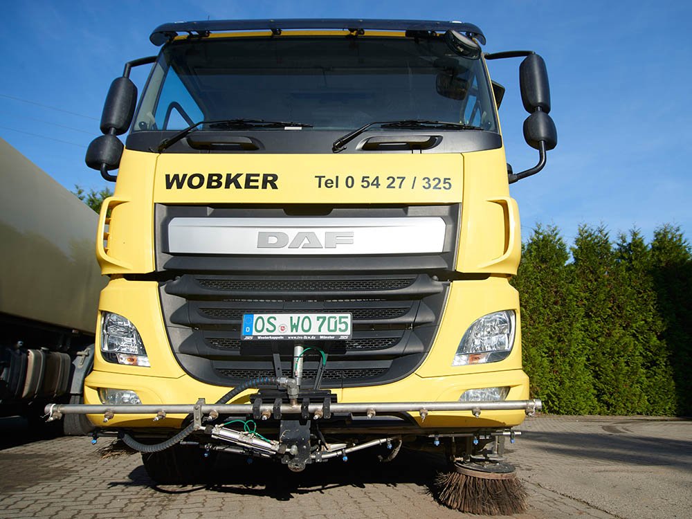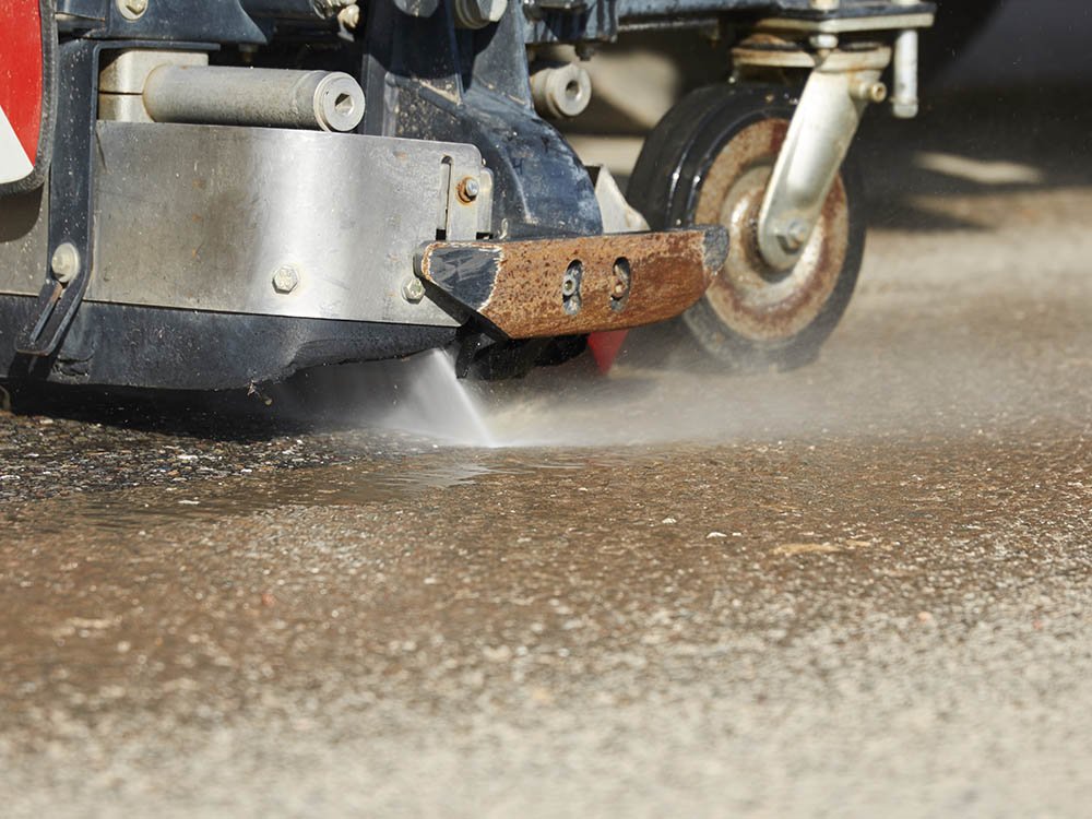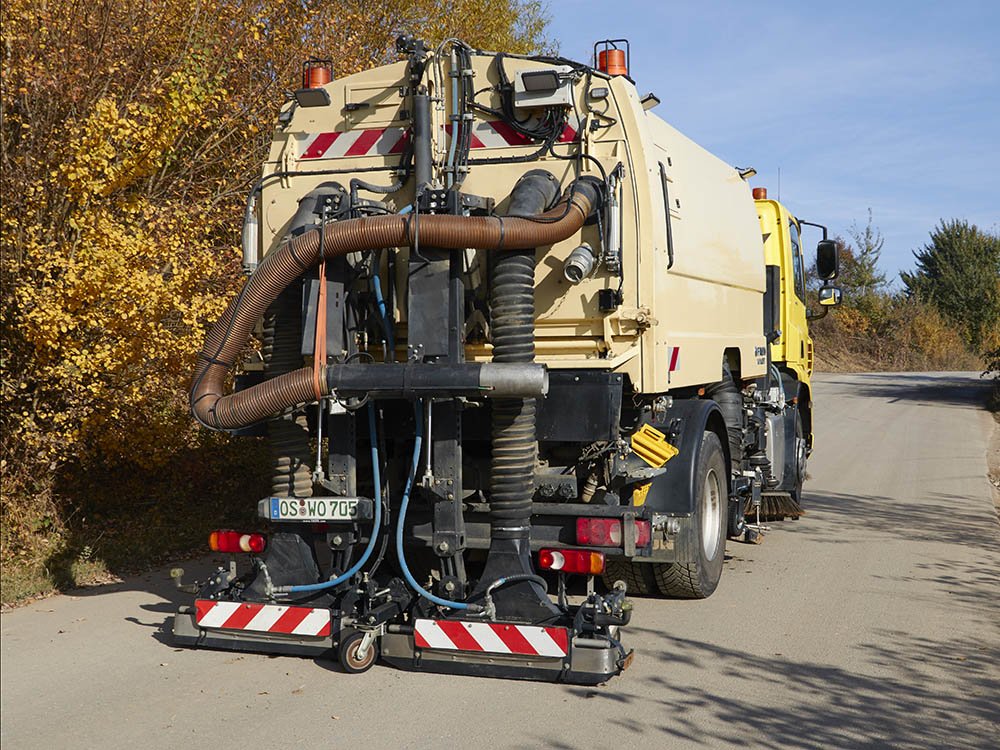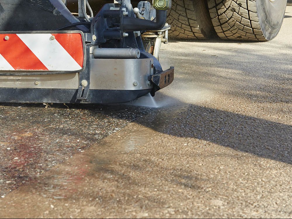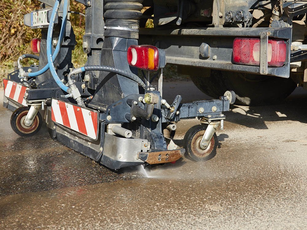 Durch gestiegene Anforderungen der Auftraggeber, die den Schichtenverbund zwischen altem Unterbau und neuer Deckschicht betreffen, wurden neue Reinigungssysteme notwendig. Seit 2012 setzen wir hierfür eine an den Kehrmaschinen montierte Hochdruckwaschanlage ein. In Verbindung mit dem gleichzeitig erfolgenden Absaugen des Wasser/Schmutz-Gemisches können wir allen Anforderungen der Baustelle entsprechen, es sind lediglich die üblichen Durchfahrtsbreiten für mittlere Lkw notwendig.